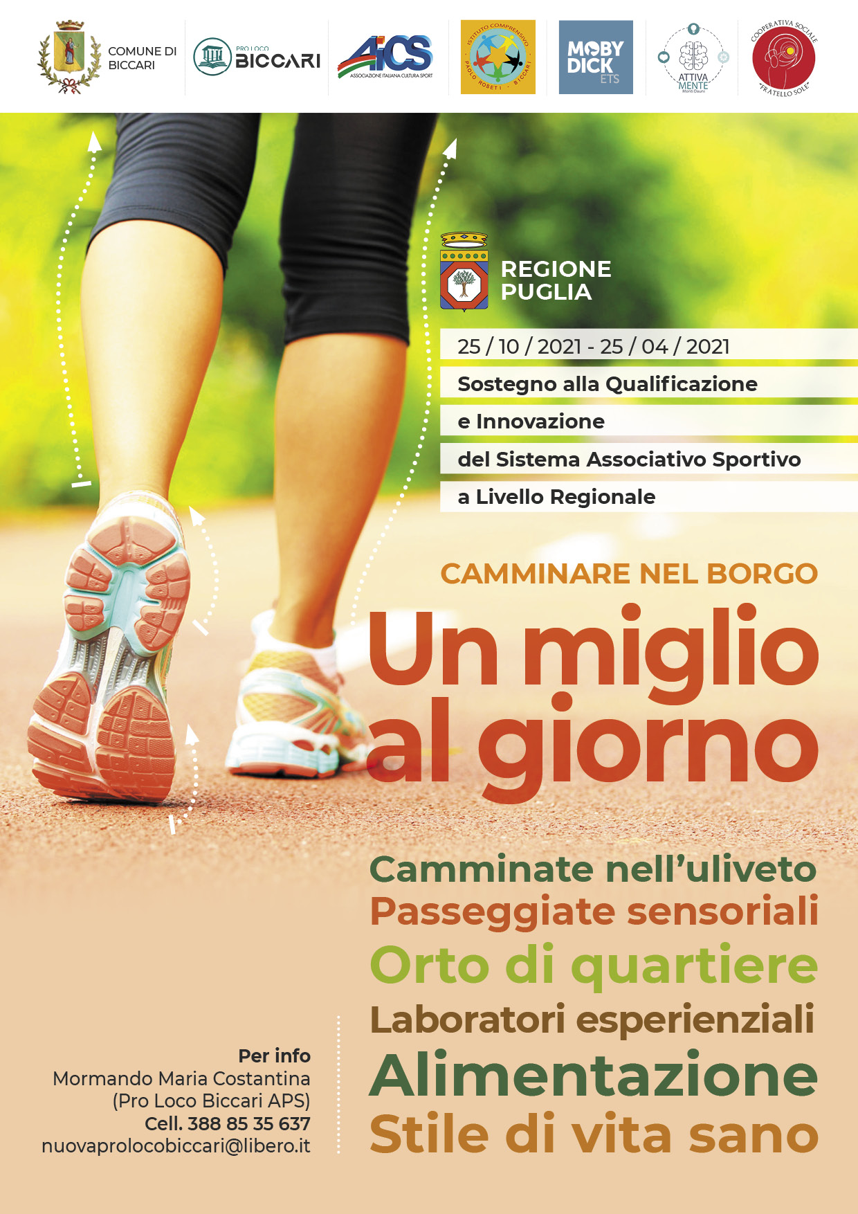Il programma intende rivolgersi a tutti coloro che vogliano intraprendere un’attività facile come quella di camminare in modo costante e supervisionato da Laureati Magistrali in Scienze Motorie per migliorare il benessere psico-fisico e la qualità della vita a qualsiasi età, vicino e lontano da casa. Questo consolida politiche a favore di sane abitudini: azioni per il benessere di prima infanzia, giovani e anziani. Obiettivo principale di questo progetto è incentivare gli stili di vita corretti, in particolare alimentazione e attività motoria fra gli allievi della primaria, coinvolgendo tutti i componenti della famiglia.